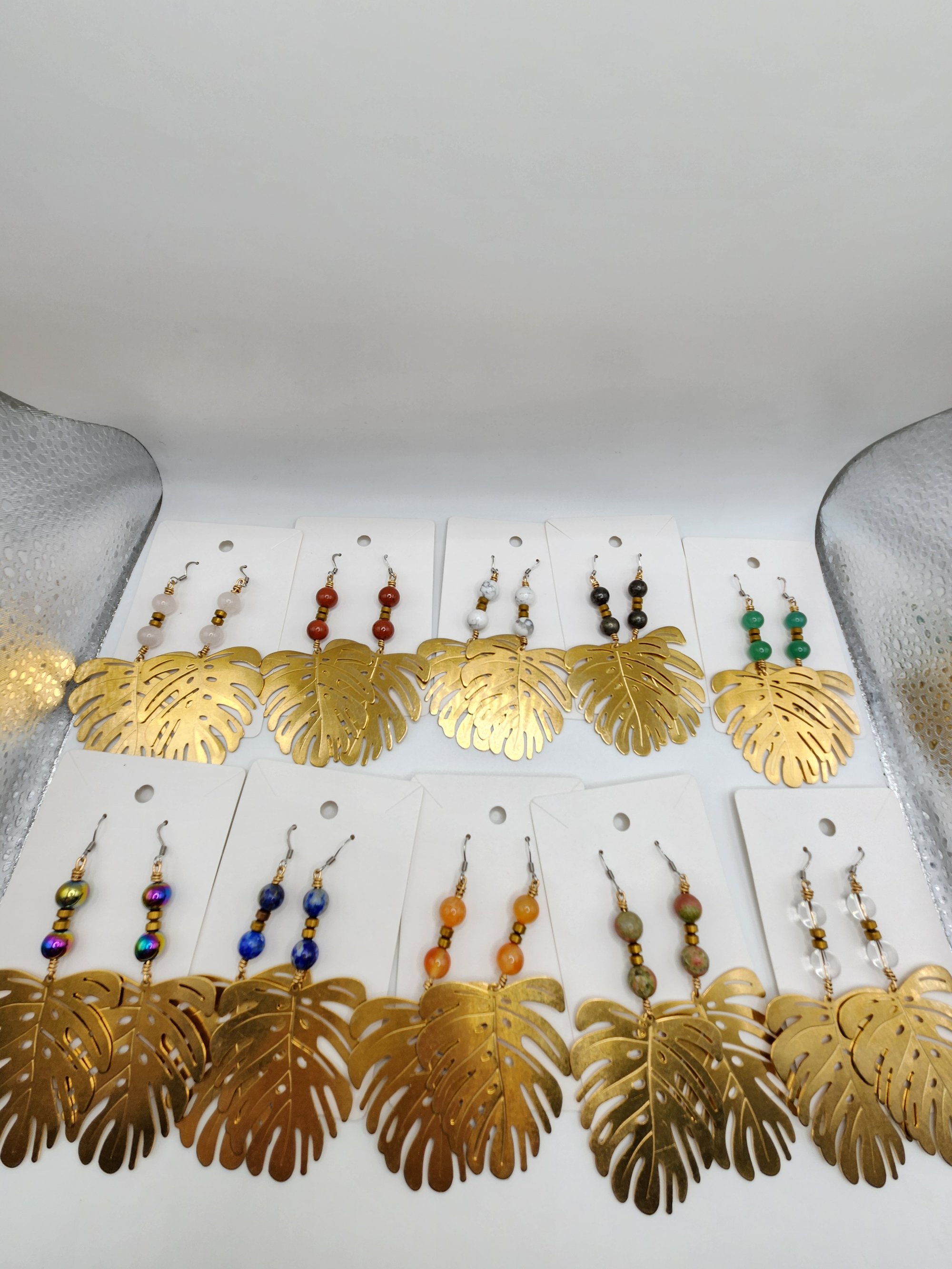 Brass Monstera with real crystal beads, stainless steel earring hooks